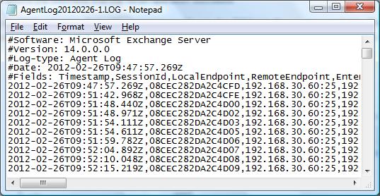 Se utilizan para registrar las acciones realizadas sobre un mensaje por un agente anti-spam específico que tenemos instalado en un servidor con el rol EDGE o HUB Transport. Por defecto están habilitados. La ruta de ubicación de estos ficheros es C:\Program Files\Microsoft\Exchange Server\V14\TransportRoles\Logs\AgentLog y este es un fichero de ejemplo: