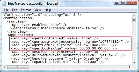 todas ellas se realizan directamente sobre el fichero EdgeTransport.exe.config ubicado en C:\Program Files\Microsoft\Exchange Server\V14\Bin y posteriormente reiniciar el servicio: